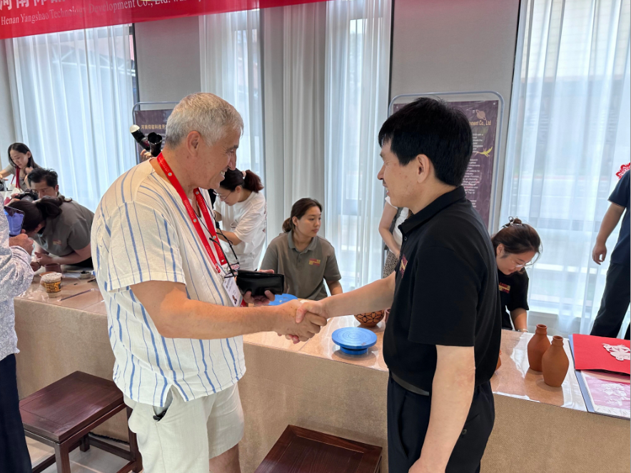 土耳其安卡拉全球咨詢集團(tuán)主席侯賽因.巴哲到河南仰韶科技公司現(xiàn)場(chǎng)體驗(yàn)區(qū)體驗(yàn)彩陶彩繪技藝,對(duì)仰韶文化的魅力贊不絕口。