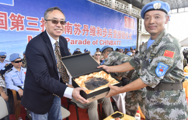 聯(lián)南蘇團(tuán)維和部隊(duì)向國(guó)際友人贈(zèng)彩陶助和諧